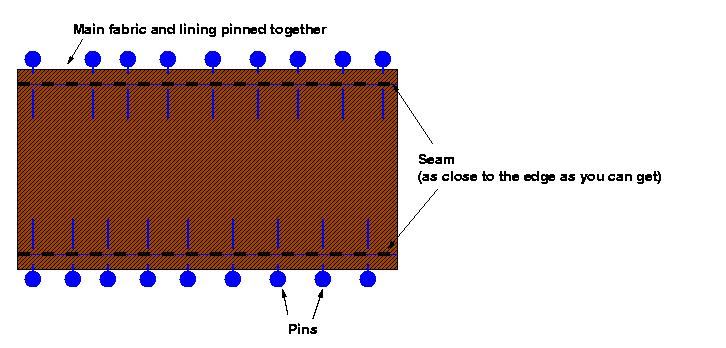 Place the pins closer together than before, every 2-3 inches. Now that the "main fabric" is pinned, do the same thing with the lining fabric. Make sure you get the corners (where the lining meets the main fabric) tucked in.