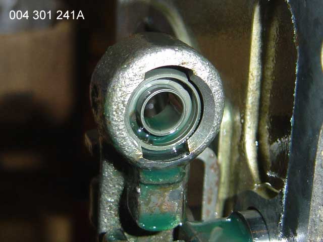 The first thing you'll notice that's different about the nose cone is that the bushings are different than the 002. Instead of the front bushing having a seal pressed into it, the seal is plain. Instead of a bushing that wears, there is a special bearing with balls somewhat like a needle bearing except it can slide as the shift lever moves. At the rear there is a similar bearing and you can easily remove them and press new ones in. This nose cone design will be less likely to wear the hockey stick compared to the 002 nose cone and you can see why an 091 nosecone upgrade is offered by the rebuilders for the 002 transmission. Both bearings should be lubed with MoS2 grease for long life.