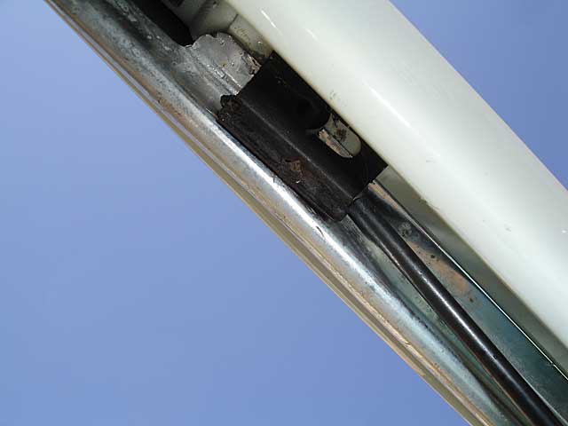 5. With the clamp undone you can pull the quarter-lite from the top by sliding the pivot pin through the opening in the frame. Look at that clamp: there's a good example of the galvanic corrosion that can occur when dissimilar metals touch.