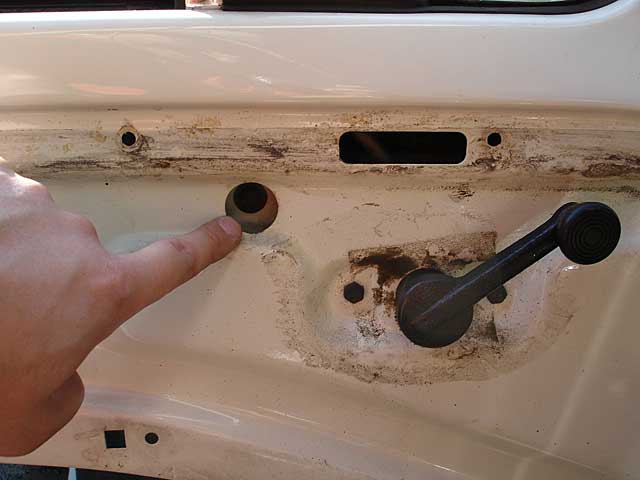 1. To remove the door panel you have to reveal the hidden fasteners. Carefully pry back the plastic cover of the window winder. This will reveal the #2 phillips screw.