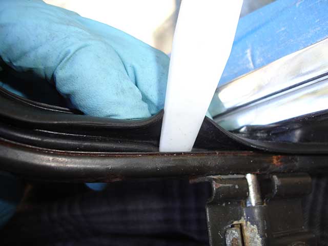 4. At the end of the scraper there is a section of rubber that is wedged between the post of the vent window and the door. If you aren't replacing the inner scraper with a new one, be careful not to tear any rotten rubber there. Use your window tool to put it free. Seal lubricant sometimes helps especially upon re-installation.