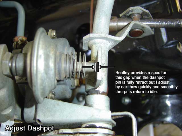 Now you can screw back in the dashpot. Bentley gives a spec of 0.04mm as the distance between the plunger and tab when fully pressed in. Not only is this awkward to measure but not very useful because the dashpot wears and the carb linkage is complex.