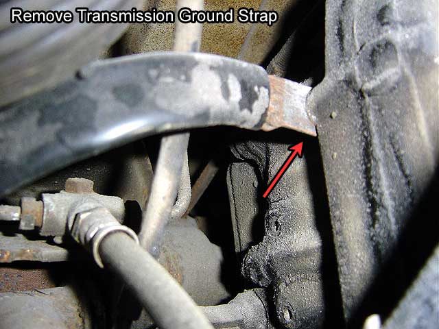 | T.4) Use a 13mm socket to remove the bolt holding the transmission ground strap on. Look for it above the backup light switch. |