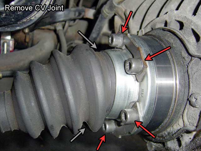 | T.5) Undo the 6 bolts that hold each CV joint on. Do not attempt removal without the proper tool: some bolts are allen head, some are triple square. Clean the heads of the bolts or risk stripping them (screaming afterwards won't help them come out but it feels good). Repeat on the other side. |