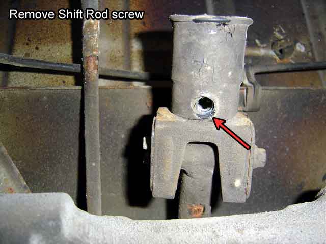 | T.11) You are now ready for removal. Grab the shift rod and pull it off the shift lever or hold in it place while the transmission is pulled back. Depending on your jack or dolly you might not clear the rear valence. Since the transmission weights so little, just lower it onto something to clear the rear valence rather than jack up the bus. |