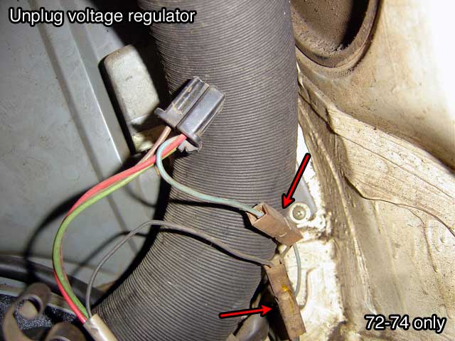 | T.3) 72-74 dual carbs: pull the two leads from the vacuum advance cutoff switch at the front of the transmission (nose cone). See Bentley Engine & Clutch page 73 for a description of this unit. It's installed on all 72-74 models except for the 74 with the M/T. |