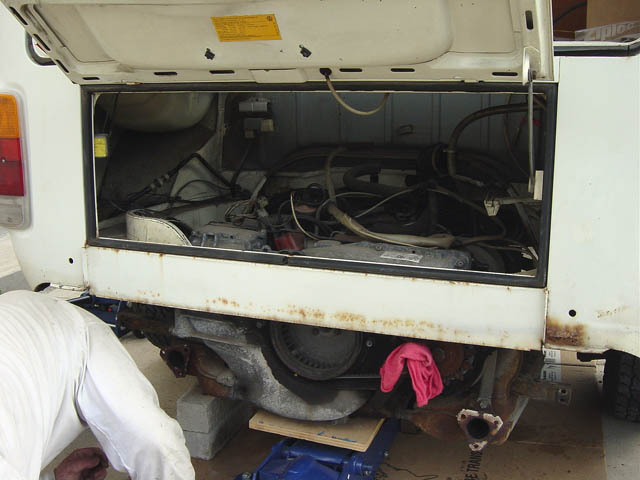 When pulling the engine, you'll need at least two jack stands and one floor jack. However two floor jacks are better than one for raising the back end of the bus without the risk of the bus falling off one jack stand because you have to raise the apron of bus about 22 inches off the ground for the engine to clear the body.