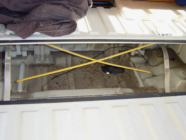 Disconnect the two wires from the fuel sender on the top of tank. There is a brown ground wire that screws to the top of the fuel tank compartment to ground the sender. The other brown wire is covered in a black plastic jacket and leads to a grommet hole at the back and to the right.