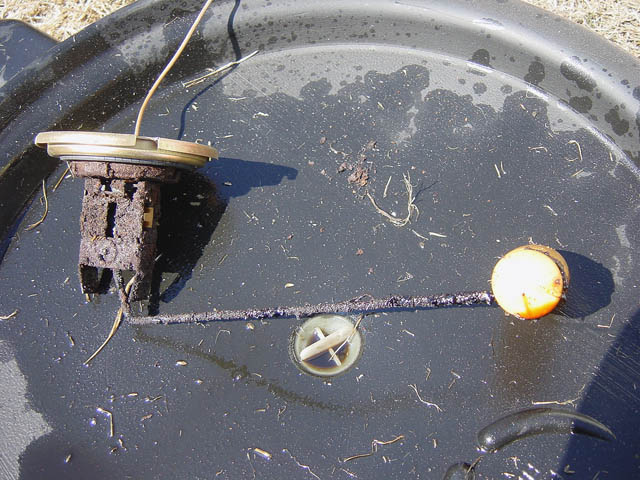 The inside of your tank will at least be rusty, but it may also contain sludge or varnish from the "decomposing" gasoline. You may find something that fell in through the filler neck, who knows. If gas was sitting in your tank for several years, you'll probably find a tar-like sludge inside. (Some of it was made into that ball in the picture and letting that ball of goo sit overnight demonstrated that it was basically a molten glass like liquid that oozed, very slowly, into your fuel lines.) Don't unclog the fuel outlet and return line on the bottom of the tank just yet; we'll do that after all the washing is complete.