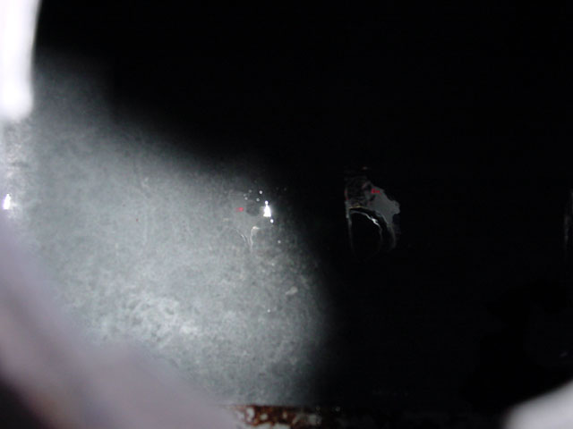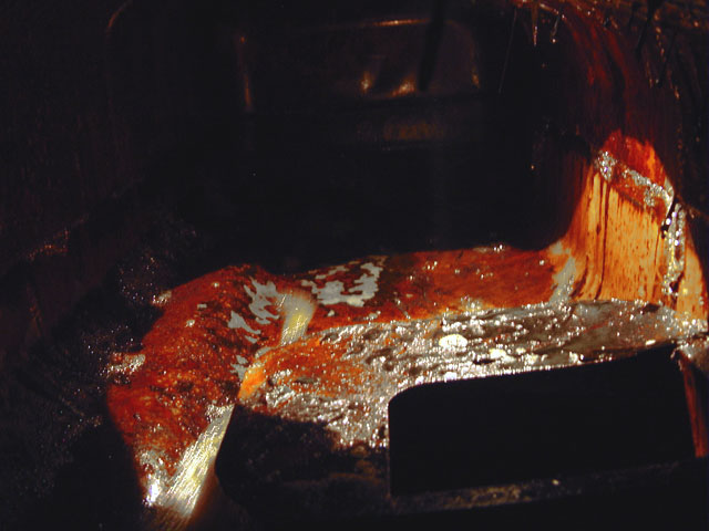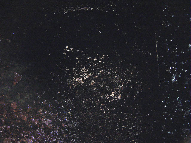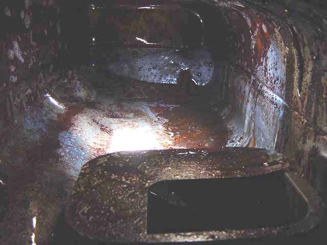 The degreasing process takes a while, which I've illustrated here. The first image was taken 24 hours later. You can start to see the nice clean metal of the tank bottom under the sludge and the sludge is dripping off the walls and ceiling. The second image is 60 hours and another quart of Marine Clean later. The third image is after 2 more quarts of Marine Clean and another acid wash: there's not much contamination left, just clean metal.