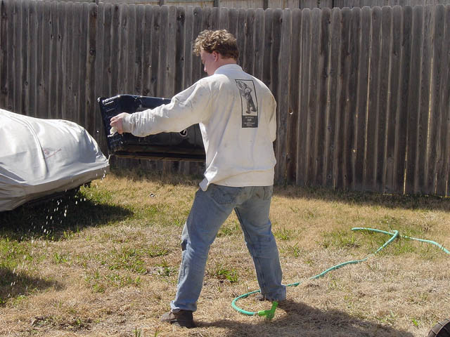 Fill the tank with enough water to slosh around (a couple of inches), then add a cup of acid. Always add acid to water. If you do it the other way around the acid will splash and it will give off gasses: you don't want to have the fumes overcome you or burn your lungs. As you can see from the pictures, everything was accomplished out in the backyard where the air circulation was good.