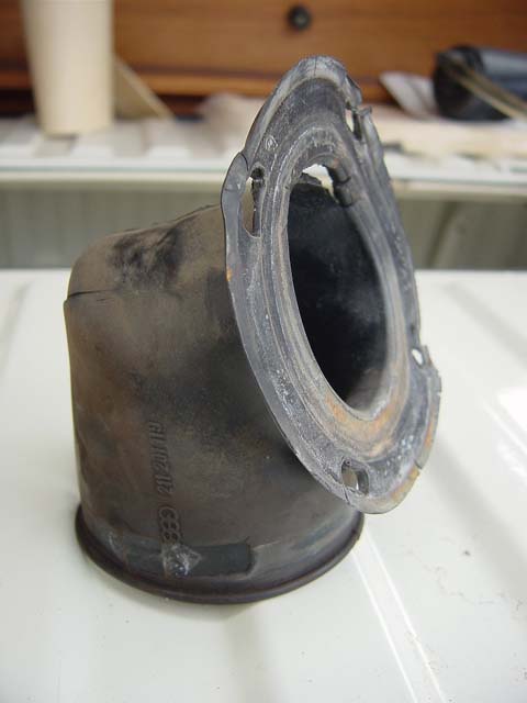 Replacing all the old rubber items while the tank is out is a good idea, especially when you can see cracks. A replacement filler hose needs to be fabricated because the original is NLA (curse you VAG!). The tricky part is figuring how to cut a straight piece to fit like the molded hose. Start with the 1 ft. of hose you bought at NAPA and cut off a 4 1/2" piece. You'll need to cut it at an angle so that the short side is about the same length as the short side of the original piece. Take your time and if you end up making an ill-fitting piece, you'll still have more of that NAPA hose left to start over again.