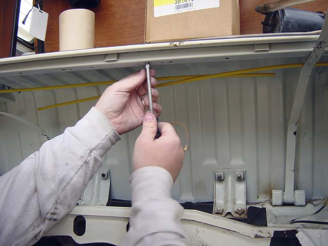 Remove the gas cap, take off the retainer ring and inspect the filler neck. It's 25 years old and although it may look ok you don't want it to crack after you've put the tank in, so replace it now. The filler neck for 74-79 busses is finally available again as a reproduction item. Any of the online VW parts vendors carry this part. To get it out, remove the round black plate that covers the ECU and then remove the ECU to ease access to the filler pipe. Put the filler neck in from the outside and remove it along with the pipe. Take note of the position of the old filler neck on the pipe with a marker in order to orient the new one the same way so it will line up properly without much effort.