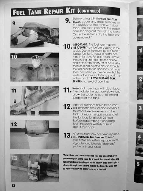Before going any further, be sure the fuel tank's breather tubes and fuel inlet and outlet on the bottom are not accidentally closed from the use of tank sealer.
