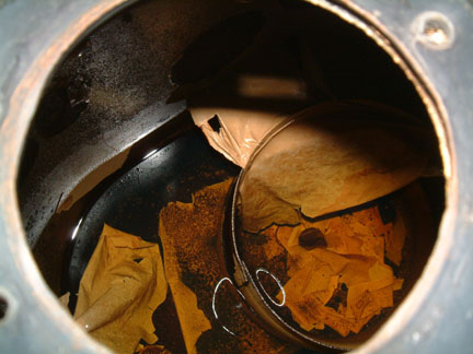 Take off the fuel sender. It comes out with a counter-clockwise twist but you'll probably need to tap it with a screwdriver and hammer to get it to rotate. The condition of the fuel sender will give you an idea of how rusty the tank is inside. There is an o-ring (113 919 131A) under the sender that you should replace if you decide to re-use your sender because it cracks. New fuel senders come with new o-rings.