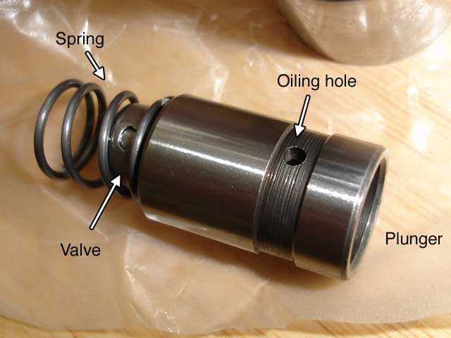 The lifter has four main components: the body, socket, plunger and valve mechanism. The body moves with the cam and the plunger/socket moves with the push rod. Riding between the two is the weak plunger spring and a cushion of oil. All of the cavities within the lifter are filled with engine oil.