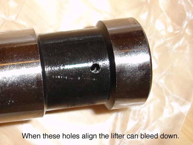 When properly pre-loaded, the oiling hole in the plunger is partially aligned with the oiling hole in the body but these facts don't completely explain why some lifters bleed down while others do not. In my experience it always seem to be the same lifters give you trouble by bleeding down and pumping up regularly from the engine sitting for long periods.