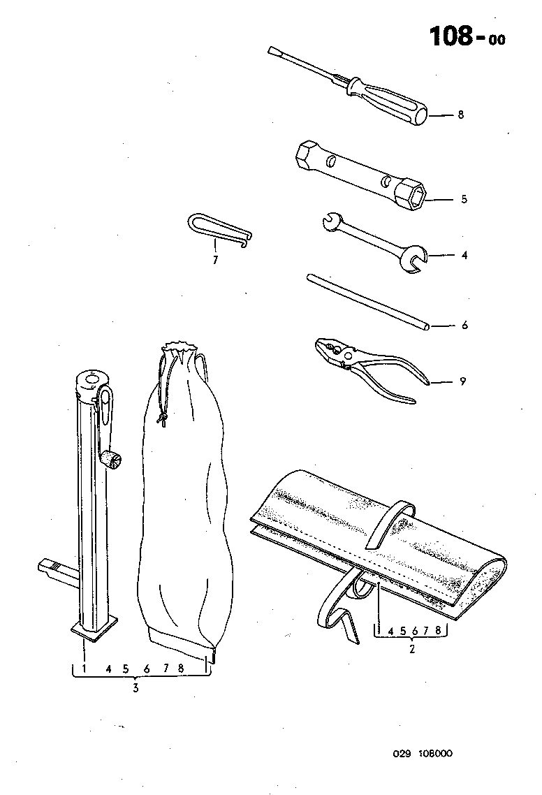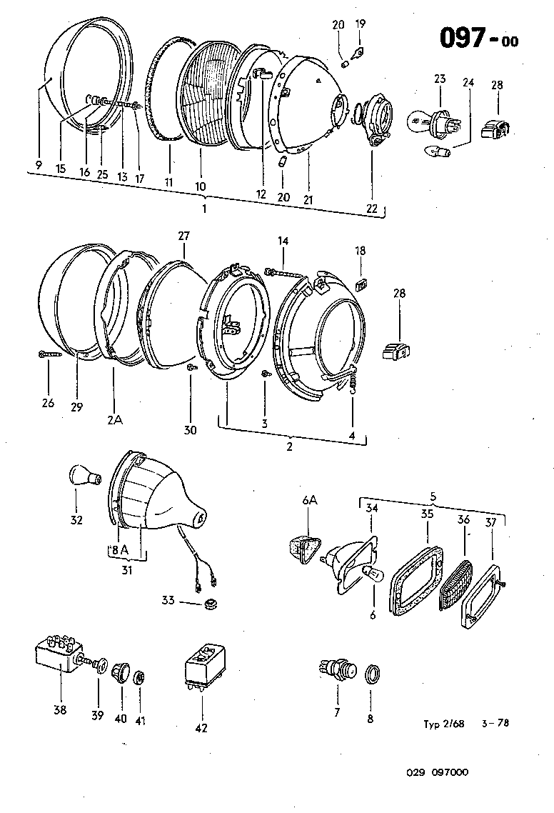 1 - Engine, Clutch | 2 - Gastank and Pipelines, Exhaust System, Heater | 3 - Transmission | 4 - Front Axle, Differential, Steering | 5 - Rear Axle | 6 - Wheels, Brakes | 7 - Hand and Footlevers, Safety-covers | 8 - Body | 9 - Electrical | 0 - Extras