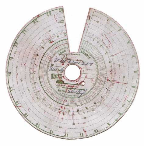 A piece of paper was inserted into the back and locked with a key by the business owner to prevent tampering by the driver. The clock inside rotated the paper while a needle scratched it. The paper was backed in red with a white covering which left a red mark as the needle erased the white. As the speed increased the device made a mark further towards the edge of the paper and in this way the company knew when and how fast the driver went during the day.