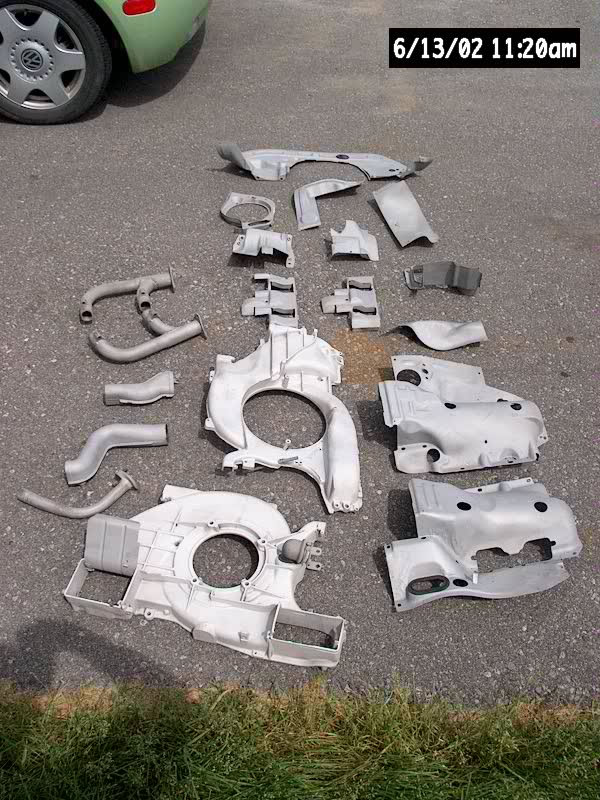 I had all the tin and shrouding blasted at the local monument shop for a great price and I was extremely pleased. The tin was perfect. I found one small pin hole on the driver side (near cylinder 3). |